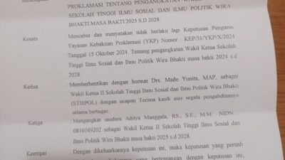 Denpasar – Yayasan Kebaktian Proklamasi (YKP) memutuskan mencopot Wakil Ketua II (Waket II) Stispol Wira Bhakti, Drs. I Made Yunita,…